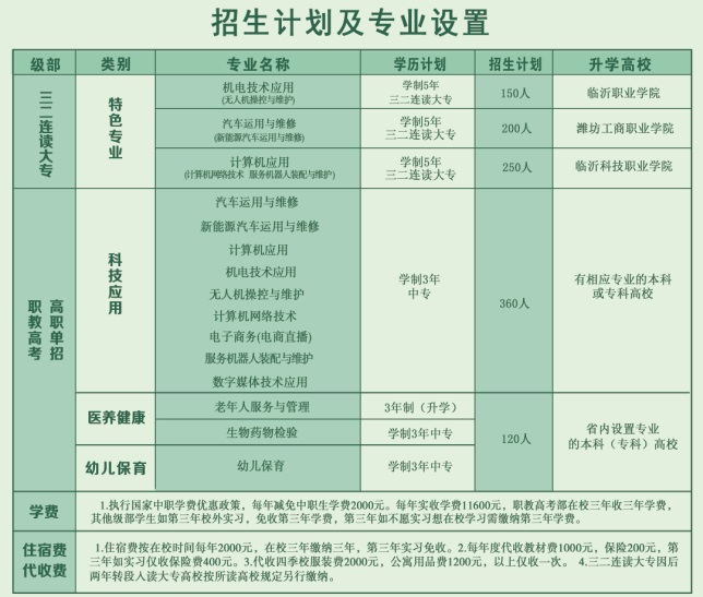 學校三二連讀大專計劃是經省教育廳審批,與臨沂職業學院,臨沂科技職業學院、濰坊工商職業學院3所公辦專科高校全日制連讀培養。前三年在本校,后兩年轉段入讀高校,政策規定專科畢業退伍后免試免費學習全日制本科專業。學校在濟寧、菏澤、棗莊均有省統一計劃,請考生及時關注本市教育招考院招錄信息。當前全省高考生逐年大幅增加,普通高中生高考超400分才有機會選擇這3所高校,利用優越的職教改革政策,中考低分還有機會被幸運錄取,今年我市3+2大專填報線中考260分左右,若早來學校咨詢面試,辦理報名,搶報第一批次三二連讀大專志愿,因其他學校錄取分數高,有的專業錄取線達500分以上,建議家長早選報學校。分清有的學校3+2不通過準考證批次志愿填報,僅頒發高技畢業證,非大專學歷教育,報考專業資格證受限,請家長選擇適合學生發展意愿的學校。