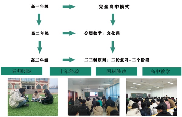 高考班分層次教學,針對學生的成績,先補課把初中語、數英基礎復習一遍。根據個別差異的學生因材施教,讓所有的學生在學習上都有所提高,全日制分班制,每班30人,教學模式采用高中授課及管理,文化課+專業理論、技能的學習,最后進行總復習沖刺。