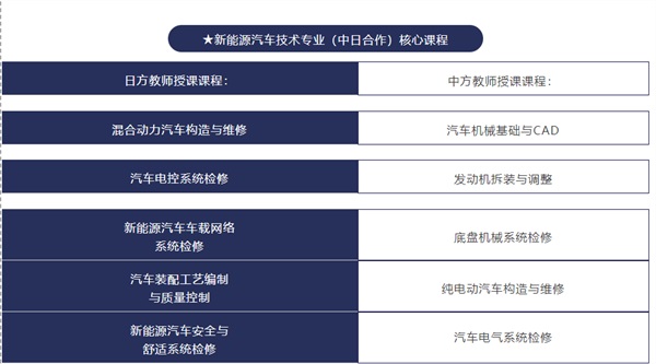 專(zhuān)業(yè)設(shè)置與汽車(chē)產(chǎn)業(yè)國(guó)際化需求對(duì)接,課程內(nèi)容與新能源汽車(chē)新技術(shù)有效對(duì)接,教學(xué)標(biāo)準(zhǔn)與日本整備士職業(yè)標(biāo)準(zhǔn)對(duì)接