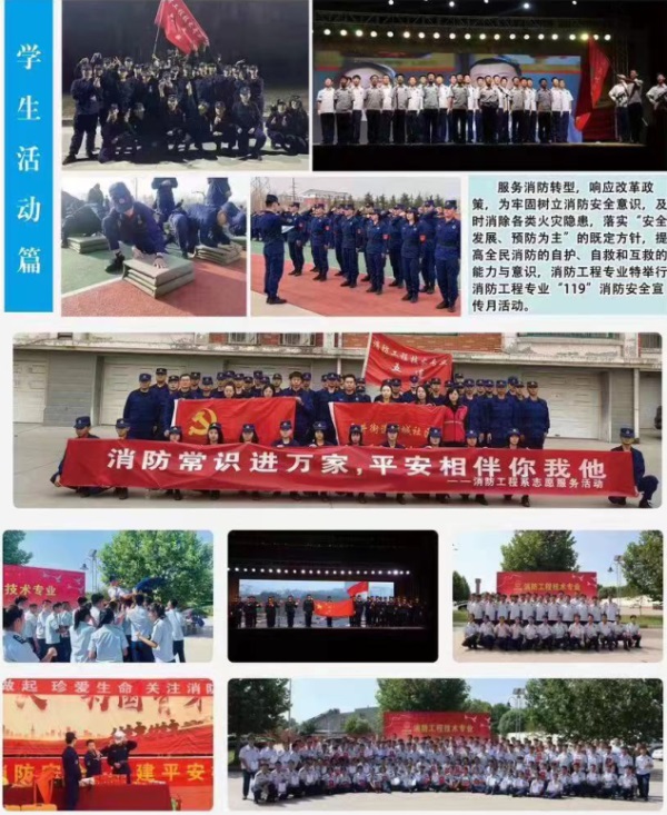 消防工程專業(yè)以軍事化管理的模式為主干,豐富多彩的主題生活為依托,通過思想政治教育,校園文化熏陶,社會(huì)實(shí)踐鍛煉,多種途徑,使學(xué)生成長成才。
