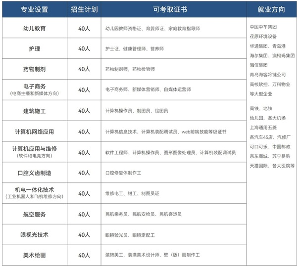 重點(diǎn)突出專業(yè)技能訓(xùn)練和專業(yè)證書考取,學(xué)校與京東方、上汽通用汽車、青島港、地鐵公司等知名公司和頭部企業(yè)合作,聯(lián)合培養(yǎng)人才,為學(xué)生提供高端崗位和高薪待遇