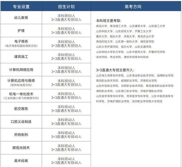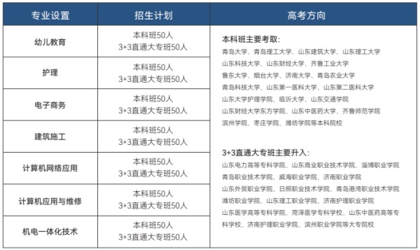 通過(guò)三年學(xué)習(xí),升入山東科技職業(yè)學(xué)院、濟(jì)南職業(yè)學(xué)院、日照職業(yè)技術(shù)學(xué)院、青島港灣職業(yè)技術(shù)學(xué)院、青島工程職業(yè)學(xué)院等高職院校繼續(xù)深造:大專畢業(yè)后可參加專升本,考取本科。