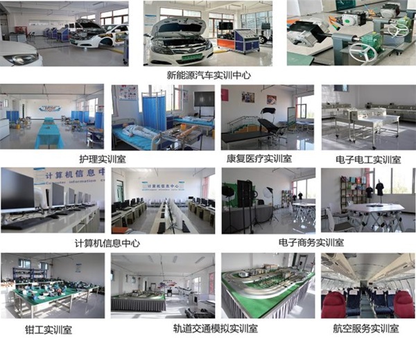 學校投資500余萬建有全市第一家專用教學飛機、軌道交通模擬實訓室、護理實訓室、康復醫療實訓室、新能源汽車實訓中心、BIM技術中心、機電機械實訓中心、計算信息中心、舞蹈室、鋼琴室、繪畫室、電商直播室等15個專業實訓室,能滿足各專業的實訓要求。